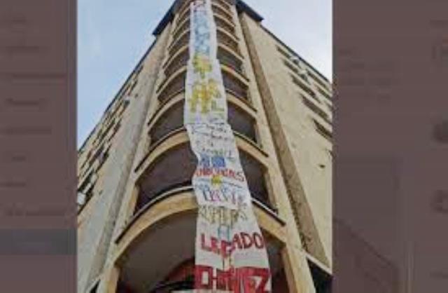 Estudiantes que viven en la residencia estudiantil Livia Gouverneur en Plaza Venezuela colgaron una pancarta en señal de protesta para denunciar que recibieron orden de desalojo. La administración de Maduro pidió que se retiren del edificio porque será usado para alojar a pacientes con coronavirus.