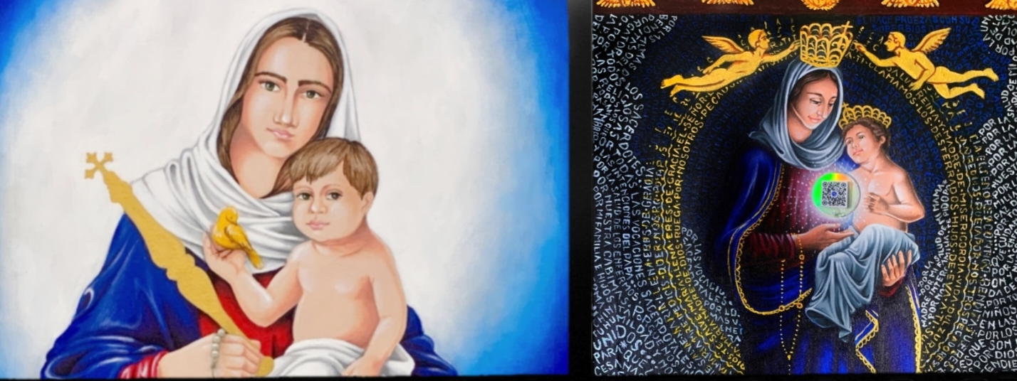 Su obra se destaca por un elemento central e innovador como es el código QR estratégicamente ubicado de manera que parece ser entregado por la Virgen al Niño Jesús. Este código al ser escaneado enlaza en un video con las personas que hicieron las peticiones trascritas en la obra.