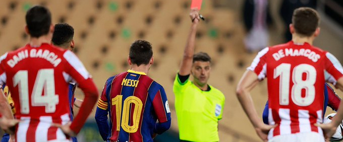 En un hecho inusual, un Messi preocupado terminó expulsado al golpear a un jugador del Bilbao.