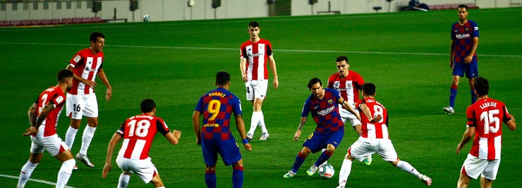 En el primer tiempo, Athletic Bilbao le jugó de igual a igual y contó con la primera y más clara ocasión para abrir el marcador en esos 45 minutos: el arquero Marc-André Ter Stegen desvió un disparo esquinado y con efecto, arrojándose hacia su izquierda. Entre los 12 y 13 minutos, tres veces probó al arco el visitante, sin puntería. Las llegadas del Barcelona fueron más esporádicas y también con remates desde afuera del área. Se jugó más en el campo catalán, aunque el local tuviera más la pelota.