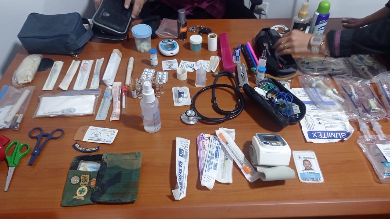 Tras su aprehensión, se le realizó una revisión corporal, donde se le incautaron múltiples insumos médicos como: antibióticos, jeringas, estetoscopio, guantes quirúrgicos, micro goteros, entre otros.