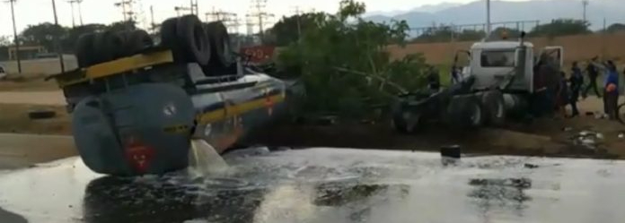 En horas de la tarde de hoy domingo, 10 de abril, una gandola de combustible se volcó producto de una colisión en la autopista del Sur, la Valencia-Tocuyito, a la altura de la distribuidora Valcro.