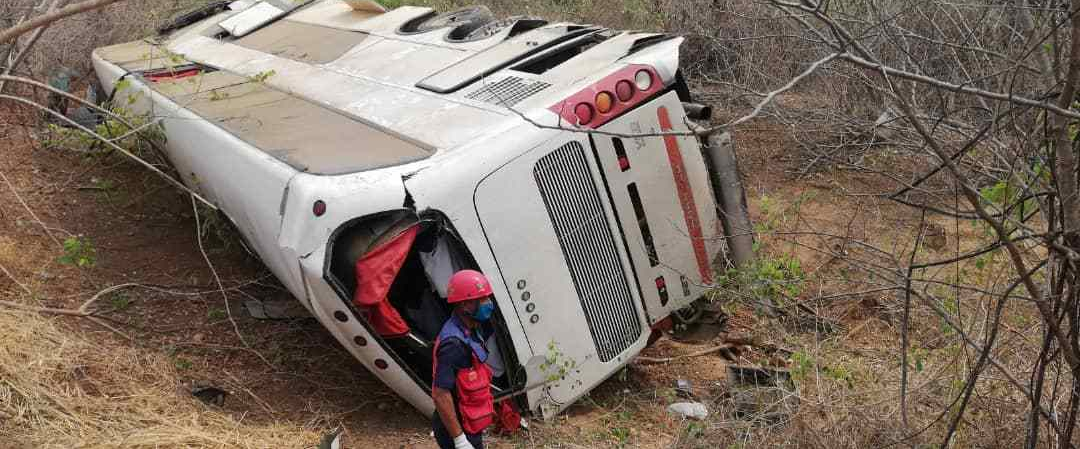 Dos muertos y 16 heridos quedó como saldo tras el volcamiento de un autobús de expresos Maracaibo en el kilómetro 52 de La Plata, municipio Simón Bolívar a la altura de la estación de servicio El Parador, en la carretera Lara-Zulia, Costa Oriental del Lago.