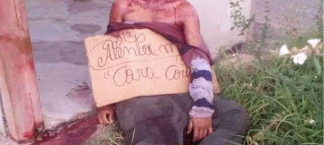 Uno de los cuerpos porta un cartel en el que se puede leer “atentamente CARACORTADA”. Habitantes del lugar manifiestan haber visto cuando los restos de los infortunados fueron tirados en el lugar a tempranas horas de la mañana.