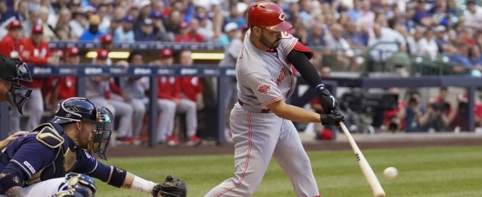 El tercera base venezolano Eugenio Suárez, vive un endemoniado momento con el madero al destapar el vigésimo séptimo cuadrangular de la temporada, en el compromiso entre Rojos de Cincinnati y Cerveceros de Milwaukee en el Miller Park.