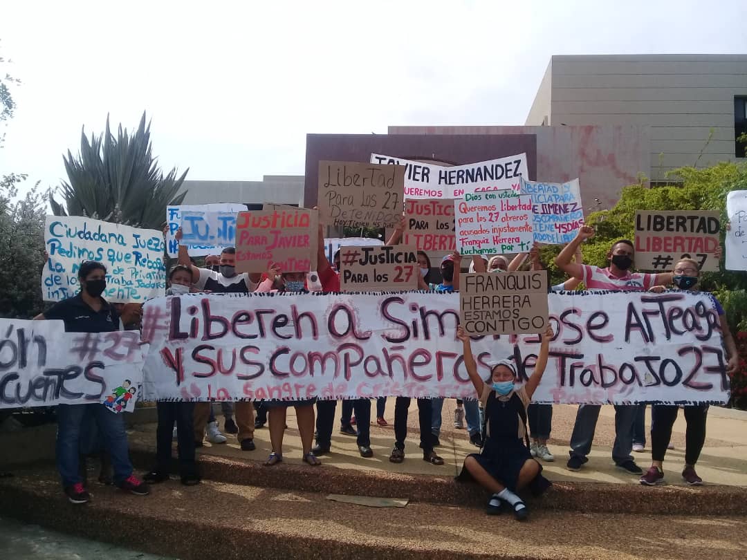 “Ciudadana jueza pedimos que rebaje la condena o dicte medida de libertad para nuestros familiares”, “Libertad para los 27”, “Queremos libertad para los 27 obreros acusados injustamente”, decían algunos carteles de los familiares durante la protesta.