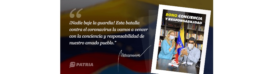 A partir de hoy, lunes 10 de agosto inicia la entrega del Bono Conciencia y Responsabilidad enviado por el presidente de la República Bolivariana de Venezuela, Nicolás Maduro, a través de la Plataforma Patria, proceso que se extenderá hasta el 20 de agosto de 2020.