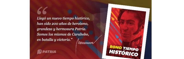 El gobierno nacional inició este miércoles la entrega del bono «Tiempo Histórico» a través de la Plataforma Patria, en ocasión de los 200 años de la Batalla de Carabobo, que se conmemorarán el próximo 24 de junio.