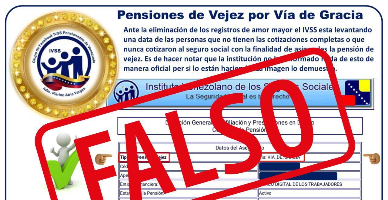El Instituto Venezolano de los Seguros Sociales (IVSS) aclaró este lunes 16 de diciembre que es falsa la información que circula en redes sociales acerca de supuestas “Pensiones de Vejez por Vía de Gracia” dirigidas a personas sin cotizaciones previas.