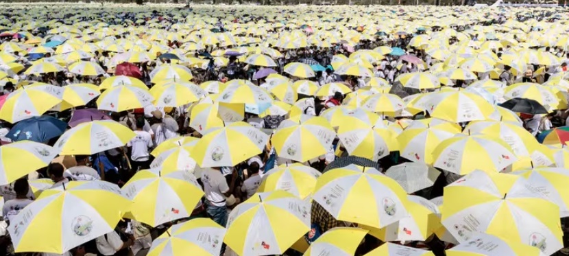 El parque de Tasitolu era un mar de sombrillas amarillas y blancas (los colores de la bandera de la Santa Sede) mientras los timorenses se protegían del sol de la tarde a la espera de la llegada de Francisco para el oficio religioso.