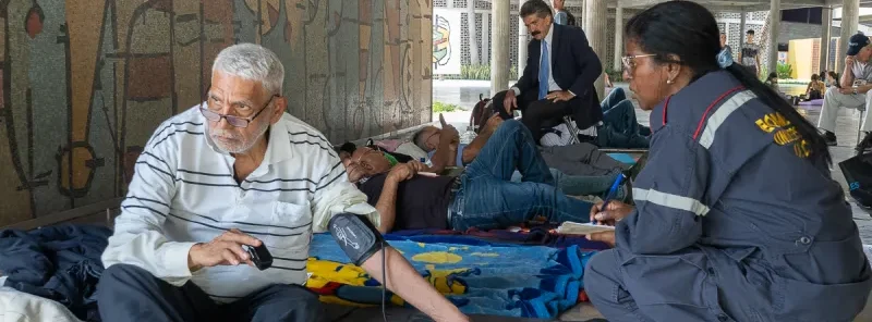 Marlon Bermúdez dice que esta mañana le tomaron la tensión y estaba un poco alta. “Me puse un poco acelerado tratando de ayudar a mis compañeros”, indicó el huelguista que viene de Paraguaná, estado Falcón.