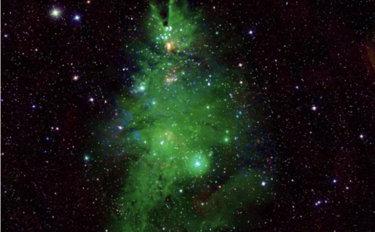 Observatorios astronómicos de la Nasa han captado un conjunto de estrellas jóvenes, situadas a unos 2.500 años luz de la Tierra, y ha realzado los colores y figuras que forman este conjunto de luces para compararlo un árbol de Navidad.