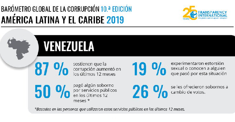 El Barómetro Global de Corrupción en América Latina y el Caribe 2019, publicado hoy por la ONG Transparencia Internacional, señala a Venezuela como el mayor foco de corrupción del continente, en un comunicado previo a la presentación del informe.