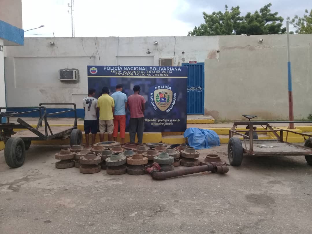 En respuesta a una denuncia recibida funcionarios de la Policía Nacional Bolivariana, adscritos a la Estación Policial Cabimas, aprehendieron a cuatro sujetos por hurto de material estratégico en el estado Zulia.
