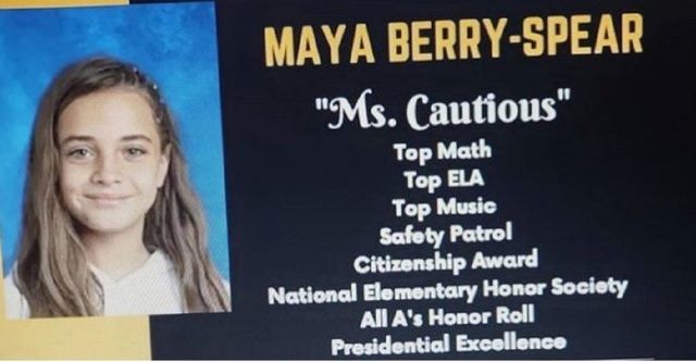 Maya Berry Spear, de 11 años, fue reconocida como alumna ejemplar en este 2020, siendo la primera en su clase en matemáticas, inglés, lenguaje, música, patrullera de Seguridad.