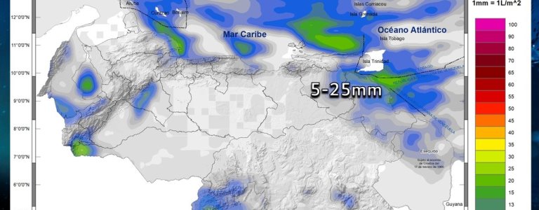 Se prevé cielo despejado y baja probabilidad de precipitaciones en gran parte del país; sin embargo, se estiman áreas nubladas, productoras de lluvias o chubascos, al norte de Guayana Esequiba, Delta Amacuro, norte de Monagas, Sucre, región Insular, Lara, sur de Mérida, este de Barinas, Bolívar y Amazonas; con índice pluviométrico entre 2-10mm, con máximos de 20mm al norte de Monagas y este de Sucre.