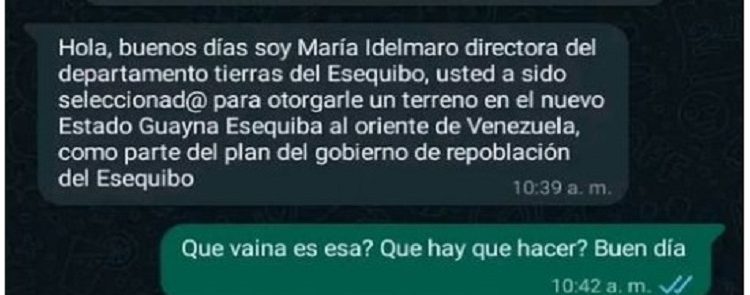 De acuerdo información de Trujillo Zona Roja en Instagram, publicó una imagen en donde María Idelmaro, se identificó la persona que ella es «Directora del departamento de Tierras del Esequibo» donde explica la selección de personas para otorgar el beneficio con un monto a pagar de 35 dólares a la tasa del Banco Central de Venezuela (BCV) por pago móvil para «sellar el documento del terreno», además, pide datos personales del supuesto beneficiario.