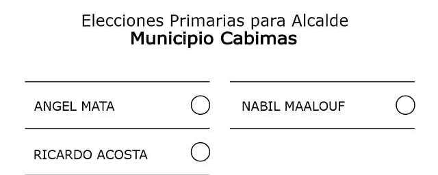 Ricardo Acosta, candidato por Primero Justicia, Nabil Maalouf, por UNT y Ángel Mata por AD, son los tres candidatos que juntos a sus simpatizantes y militantes de las organizaciones políticas que los apoyan se medirán en una contienda electoral donde se espera la participación masiva y cívica de electores que tendrán la oportunidad de ejercer su derecho al voto en los puntos de votación habilitados en cada una de las parroquias del municipio, donde la ONG Súmate ha dispuesto de la logística para el cotillón a utilizar durante el proceso.