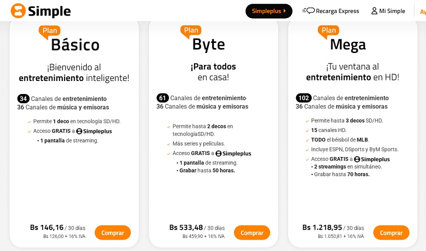 El Plan Básico cuesta Bs. 146,16, lo que significa que incremento de un 9,77% en bolívares. Además, tiene 70 canales, solo permite un decodificador y tiene acceso gratis a Simpleplus.