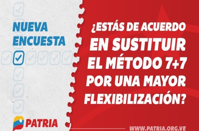 Este 17 de julio el Gobierno Nacional acordó que a través del Sistema Patria, se somete a consulta del pueblo la posible sustitución del método 7+7 por mayor flexibilización, idea que estaba siendo analizada por el Presidente Nicolás Maduro Moros, tal como lo anunció el pasado 14 de julio en una transmisión pública.