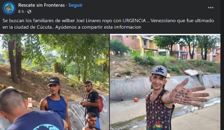 “Se buscan los familiares de Wilber Joel Linares Royo con URGENCIA .. Venezolano que fue ultimado en la ciudad de Cúcuta.. Ayúdenos a compartir esta imformacion (sic)”, menciona la publicación.